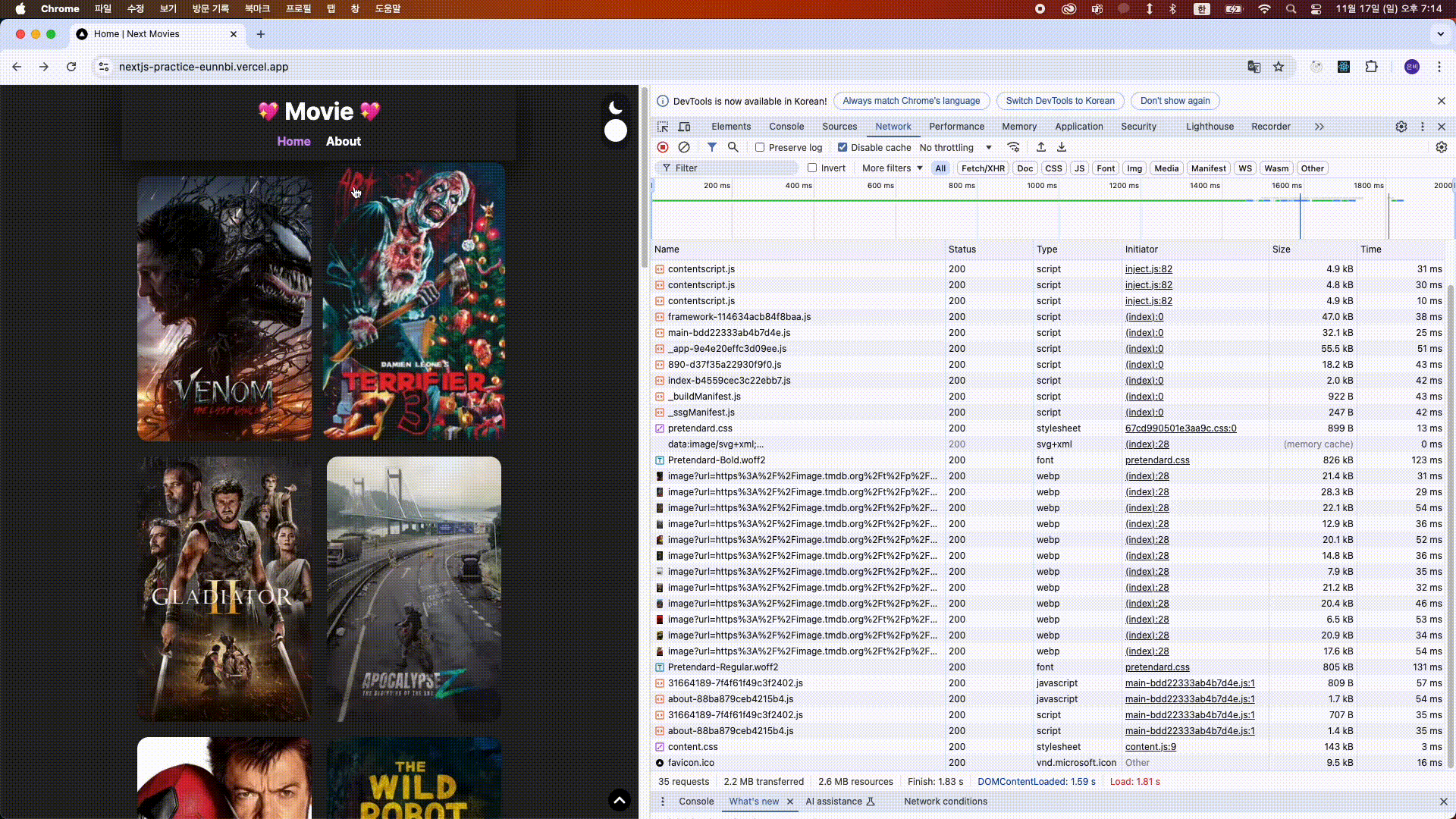 로 준비된 데이터)를 가져온다. 전체 페이지를 다시 요청하는 대신 필요한 리소스만 가져온다.영화 상세 페이지로 이동했을 때 JS 파일과 JSON 데이터(__NEXT_DATA__