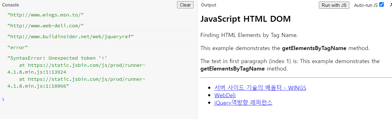 - document.getElementsByTagName(name) : 여러개 가져옴