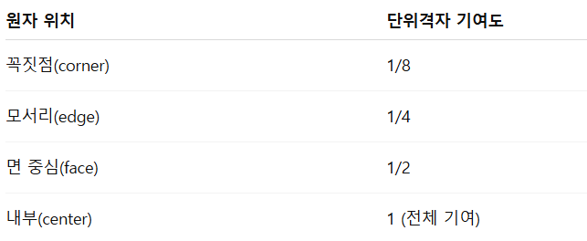 1/8 = 하나의 꼭짓점에 있는 원자는 8개의 단위 격자와 공유되기 때문에 각 단위 격자에는 1/8만 기여