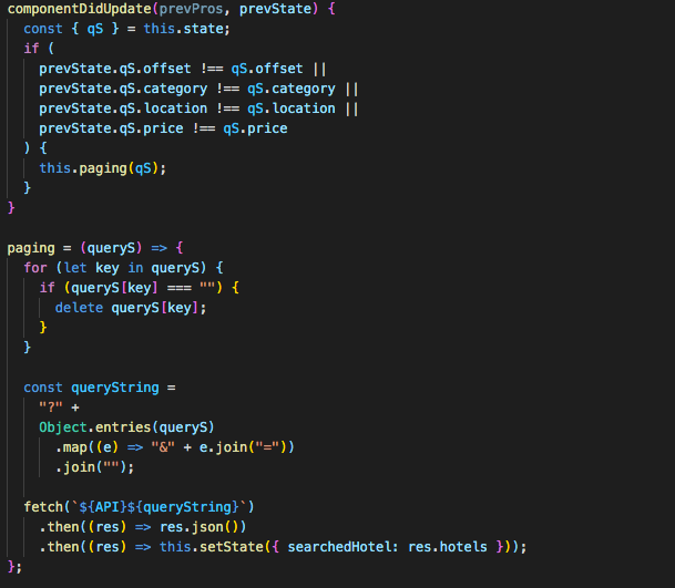 setQS 함수에서 새롭게 setState되는 offset의 값은 paging 함수에서 ?limit=12&offset=(NUM)의 형태로 변경되고 componentDidupdate에서 조건 값에 따라 paging 함수를 실행시키며, 백엔드에 내가 원하는 부분의 데이터를 요청할 수 있게 된다.