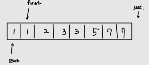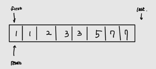 코드를 보면 3개의 포인터가 있습니다. first와 result는 배열의 시작 위치를 가르키고, last는 배열의 마지막 원소의 다음을 가르키고 있습니다.