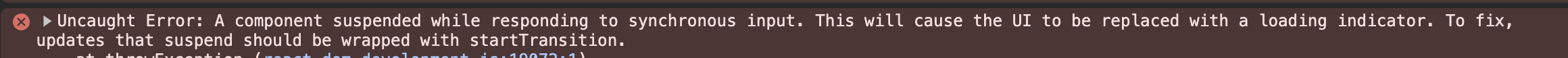 A component suspended while responding to synchronous input. This will cause the UI to be replaced with a loading indicator. To fix, updates that suspend should be wrapped with startTransition.