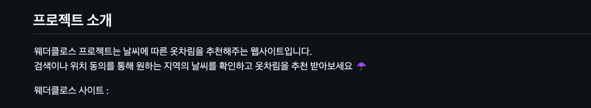 ${\textsf{\color{컬러명}웨더클로스 프로젝트는 날씨에 따른 옷차림을 추천해주는 웹사이트입니다.}}$