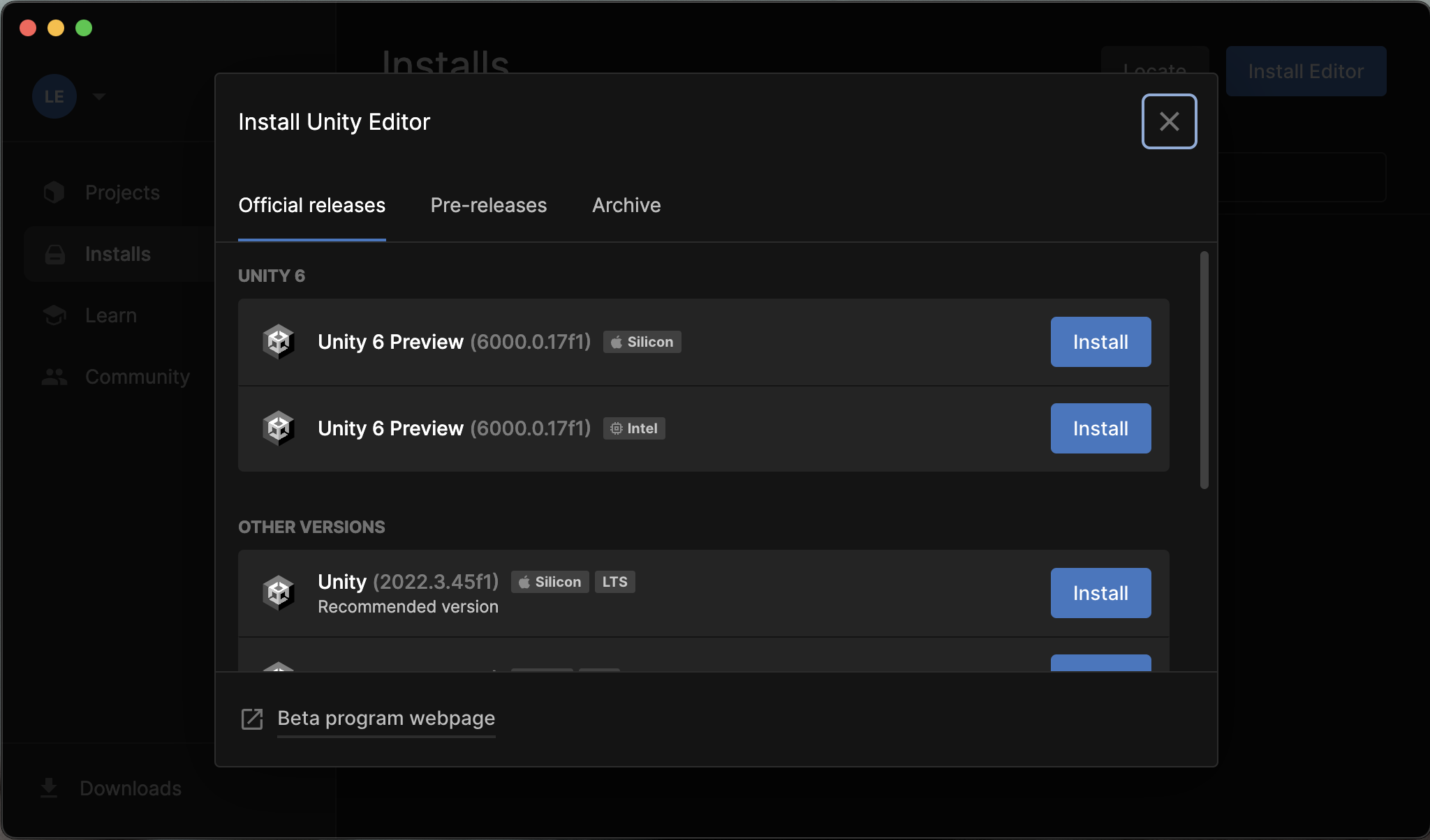 - Unity의 여러 가지 버전과 모든 프로젝트를 관리하도록 해주는 관리 툴.