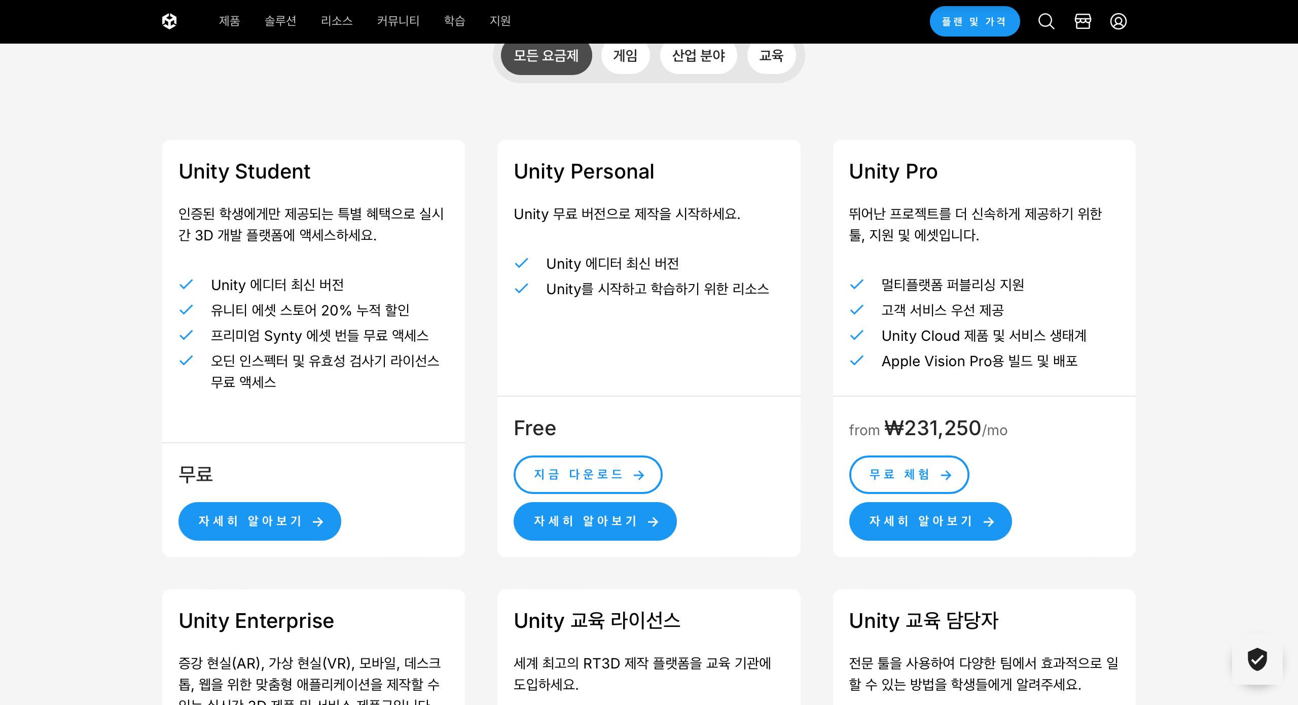 - 모든 구독 플랜에는 핵심 Unity 실시간 개발 플랫폼, 지속적인 업데이트, 베타 액세스 등이 포함되어 있음.