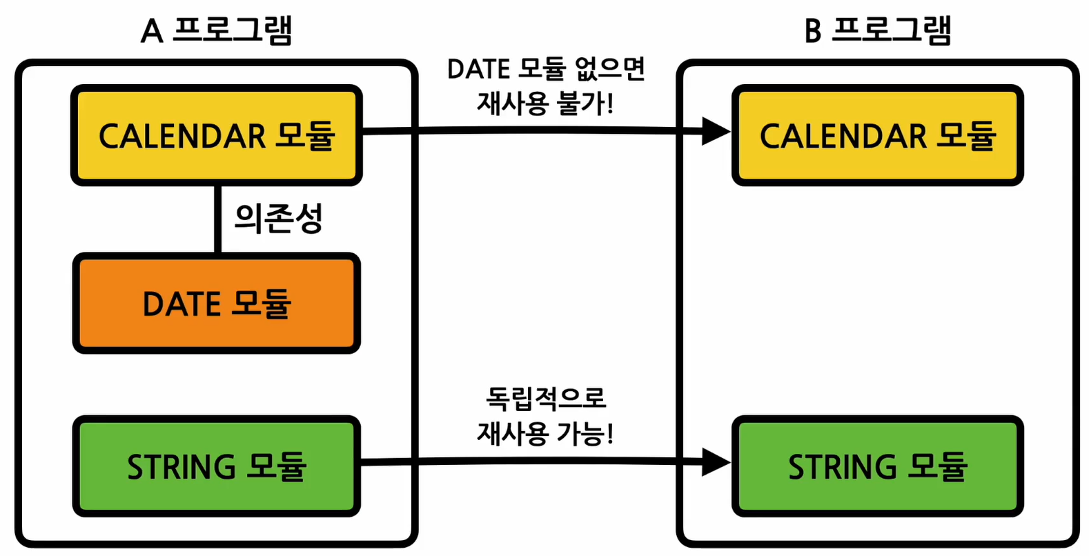 왜냐하면 재사용성이 높다는 의미는 결국 여러 모듈 간의 의존성이 낮다는 의미이기 때문이다.