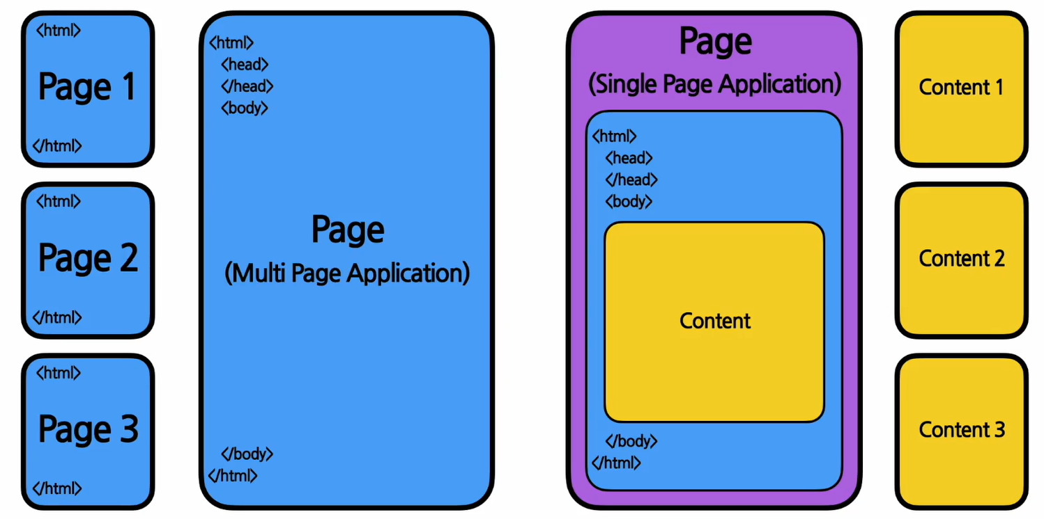 처음에는 HTML 파일의 body Tag 내부가 텅 비어있다가 해당 페이지에 접속할때 그 Page에 해당하는 contents를 가져와서 동적으로 body Tag 내부를 채워넣는다.