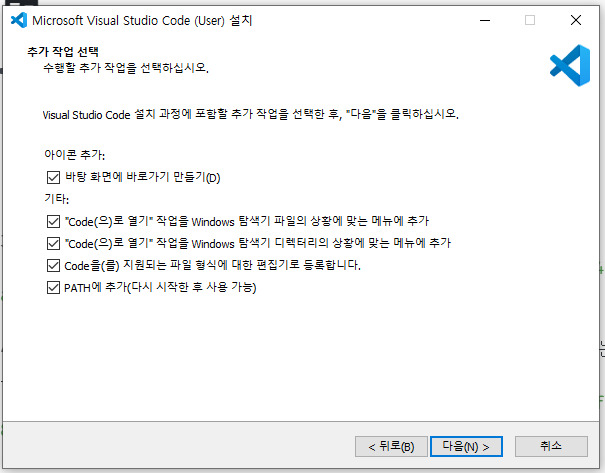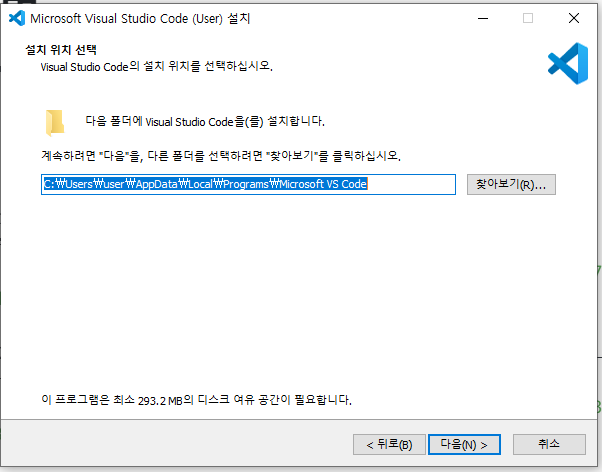VSCODE가 위치할 폴더를 지정하는 화면입니다. 특별한 위치가 있는 경우가 아니면, 기본으로 정해져 있는 위치를 그대로 둔 채 다음으로 넘어가면 됩니다.
