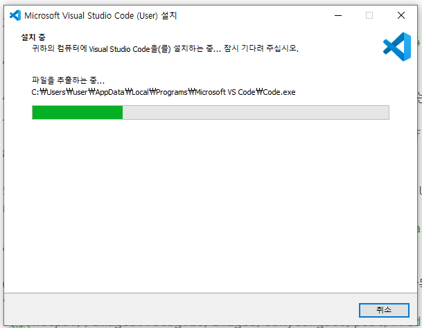 다운로드가 진행됩니다. 다운로드한 파일은 VSCODE의 설치파일입니다. 그러니 다운로드가 끝나면, 설치파일을 바로 실행하시면 됩니다.