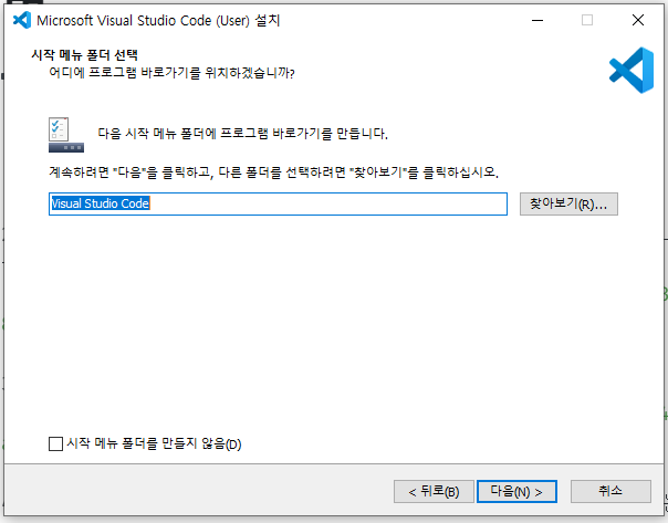 다음은 시작 메뉴 폴더 선택 화면입니다. 시작 메뉴에 VSCODE가 나타나도록 하는 것입니다.
