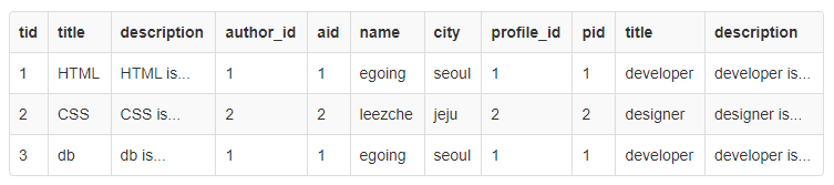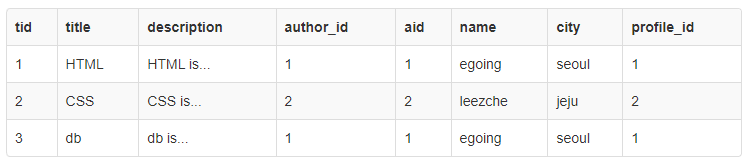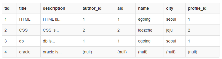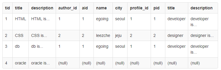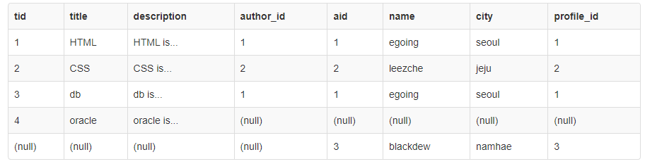 topic 테이블에만 존재하는 tid = 4 row, author 테이블에만 존재하는 aid = 3 row가 모두 출력되는 것을 확인할 수 있다.