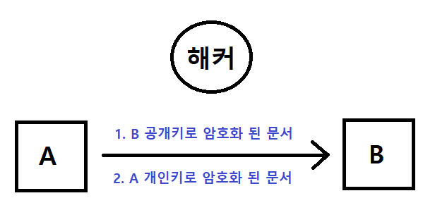 key를 등록하면 B도 key를 가지고 있어야한다. -> 어떻게 전달하지?key가 없어서 열 수는 없지만 다른 문서로 바꾸어서 B로 보낼 수 있다. -> B는 이 문서가 어디서 왔는지 알아야 한다.위 문제를 RSA 암호화 알고리즘을 사용하여 해결할 수 있다.