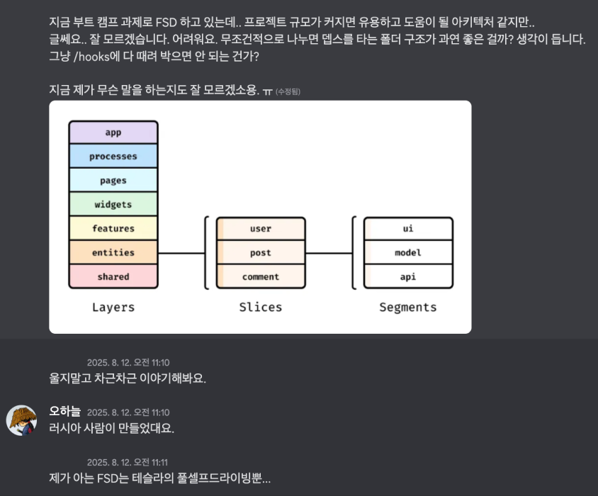 나도 같은 생각이다. 너무 복잡하다. 단순 폴더 구조를 위해 알아야 할 것들이 많은 것 같다. 내가 너무 단편적인 것만 생각하고 느낀 불호 감정인지 궁금하다. 실무에서 FSD를 사용하는 데는 어떻게 사용하는지 궁금하다. 준형 님네 회사에서 사용한다고 들었는데, 나중에 옆에 가서 들어야지. ^^