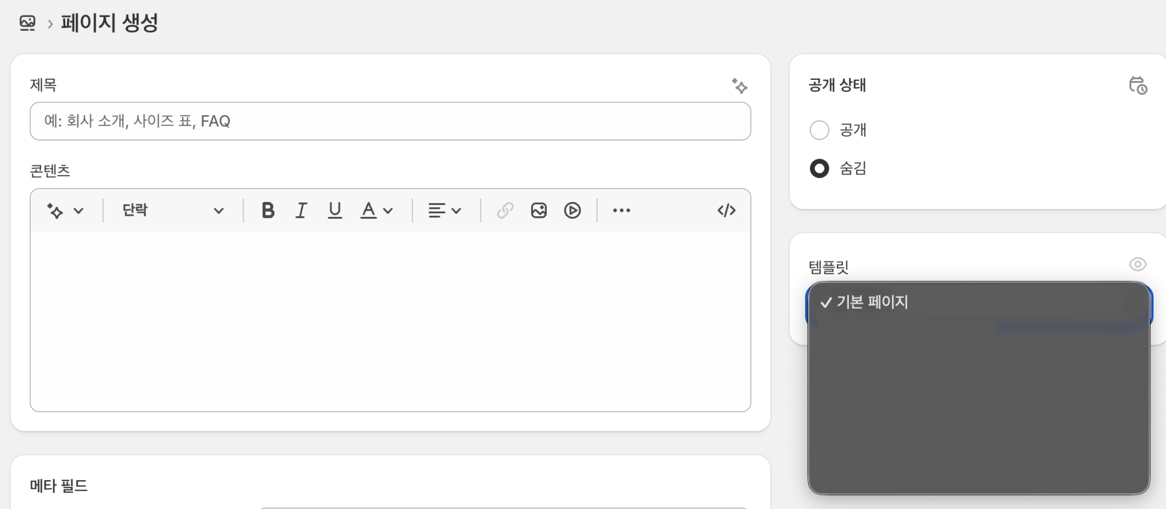 제목은 페이지 제목이 된다. 그리고 그게 URL로도 연결된다. 공개 상태는 공개로 두고, 콘텐츠는 안에 들어갈 내용을 적으면 되는데 에디터로 스태틱하게 적는 것보다는 보통 템플릿을 연결한다.