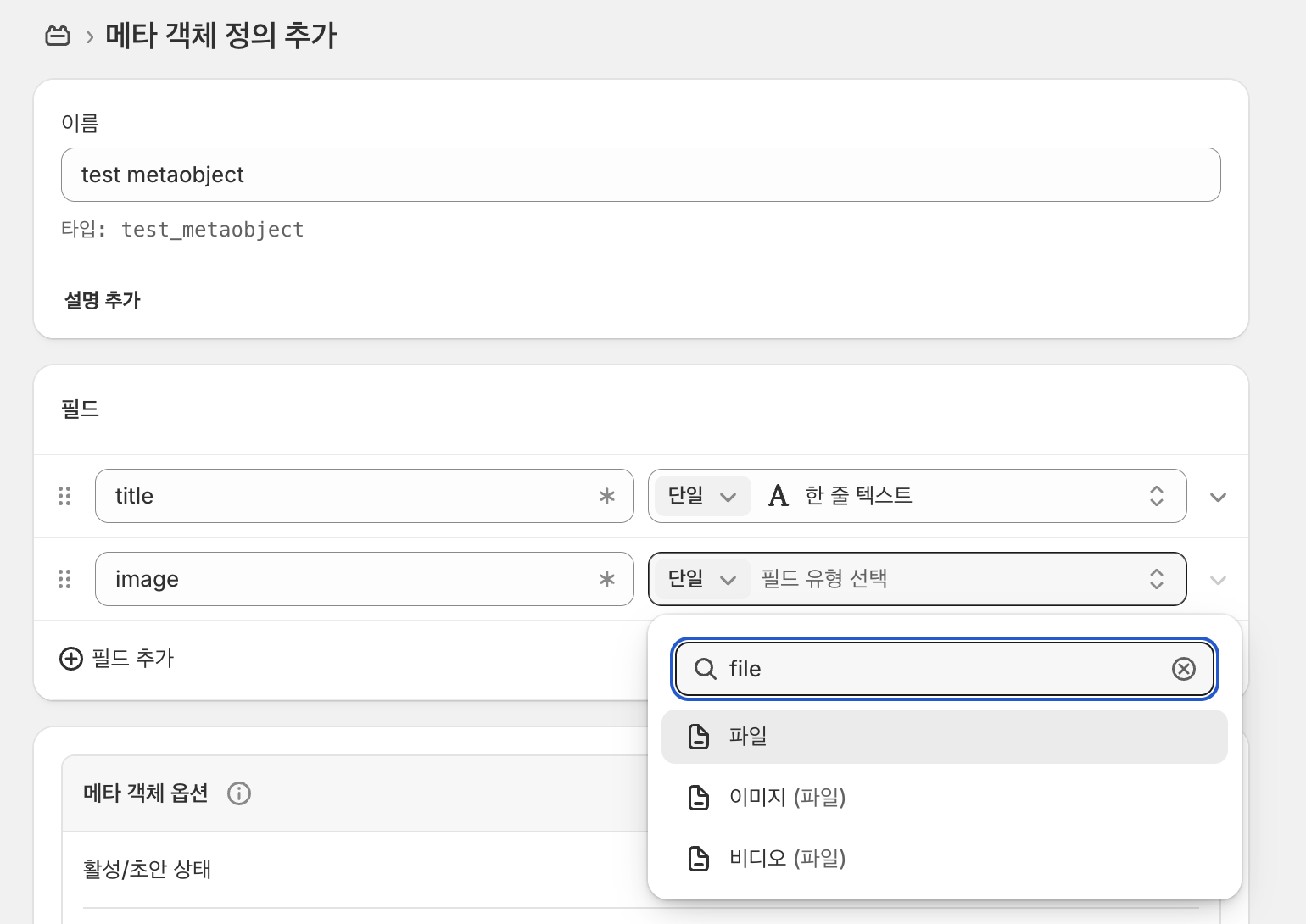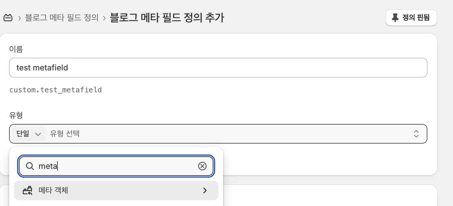 다시 설정 → 메타 필드 및 메타 객체로 들어와서, 성격에 맞는 페이지를 클릭 후 정의 추가 버튼을 클릭하면 위와 같은 화면이 나오는데, 유형을 메타 객체로 설정하면 된다. 단일은 object type으로 나오고, 값 목록은 array type으로 넣어진다. 즉 여러 개의 메타 객체를 넣을 수 있는 메타 필드도 만들 수 있다는 것이다!