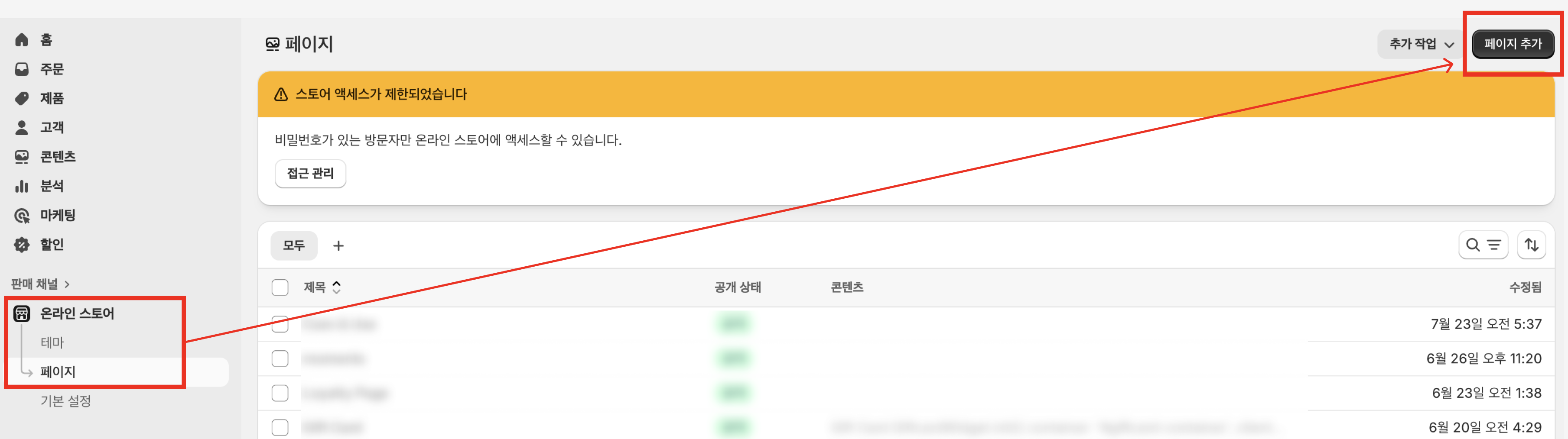 온라인 스토어 탭 클릭 → 페이지 추가로 만들 수 있다.