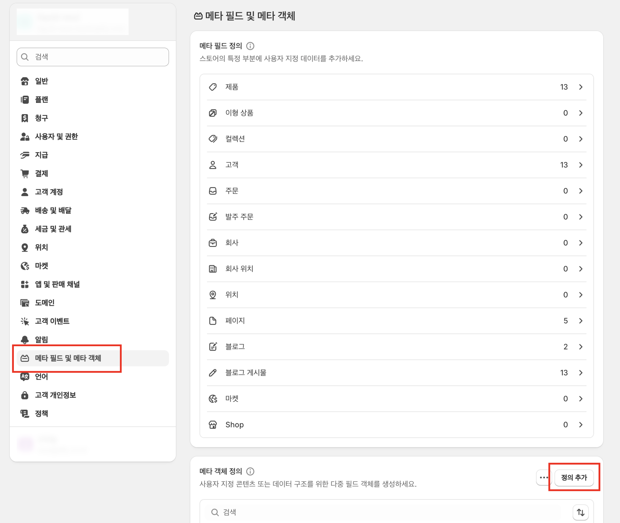 설정 → 메타 필드 및 메타 객체에서 메타 객체 또는 메타 필드를 생성할 수 있다.