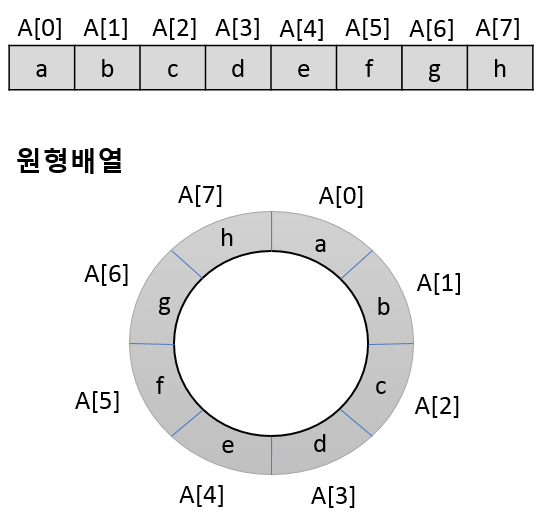 원형탁자에 8명의 사람이 앉아 있다. 각 사람의 명칭은 위에서부터 시계 방향으로 a,b,c,d,e,f,g,h라고 가정하자. 이때, 임의의 사람을 선택해서 그 사람으로부터 시계 방향으로 모든 사람들의 명칭을 순서대로 출력하는 프로그램을 만들어보자. 이 문제를 해결하는 간단한 방법은 abcdefgh 전체를 한번 더 추가해서 뒤에 붙이는 방식이다. 즉, abcdefghabcdefgh와 같이 하면 임의의 시작 인덱스에서부터 순서대로 8개를 읽으면 된다. 예를 들어 c로부터 시작한다면 abcdefghabcdefgh를 읽으면 된다. 그러나, 이러한 방식의 단점은 배열의 크기만큼 중복된 공간이 필요하고 현재의 배열을 중복 복사해야 한다는 점이다. 이러한 중복 복사 방식보다 더 효율적인 방식으로 원형 배열을 사용할 수 있다. 즉, 배열에 a,b,c,d,e,f,g,h를 넣고, 배열 인덱스를 순환하도록 조정하면, 임의의 인덱스에서 시작하여 N개를 순차적으로 출력할 수 있다. 아래 예제는 이를 구현한 샘플이다.