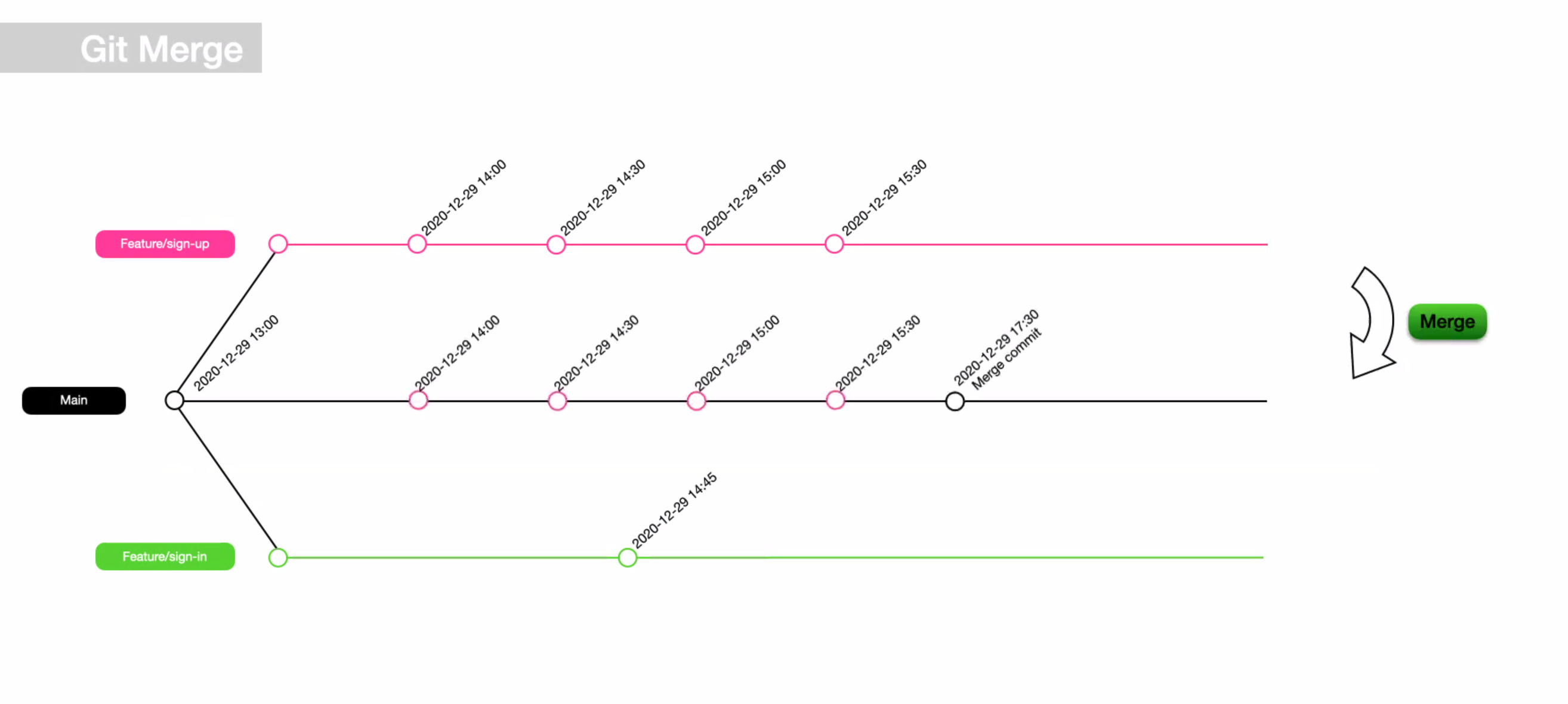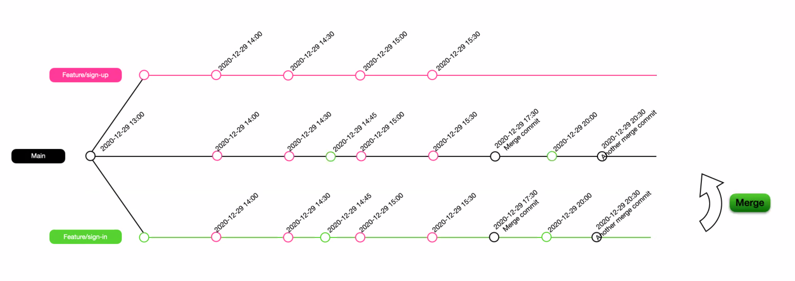 깃 머지의 가장 큰 단점은 커밋 기록이 시간 순서대로 모든 커밋이 뒤섞인다는 것이다. 이는 커밋을 브랜치 별로 구분해서 보기 어렵고 유지 보수가 어려워진다. 게다가 머지를 진행할 때마다 불필요한 머지 커밋도 남게 된다.