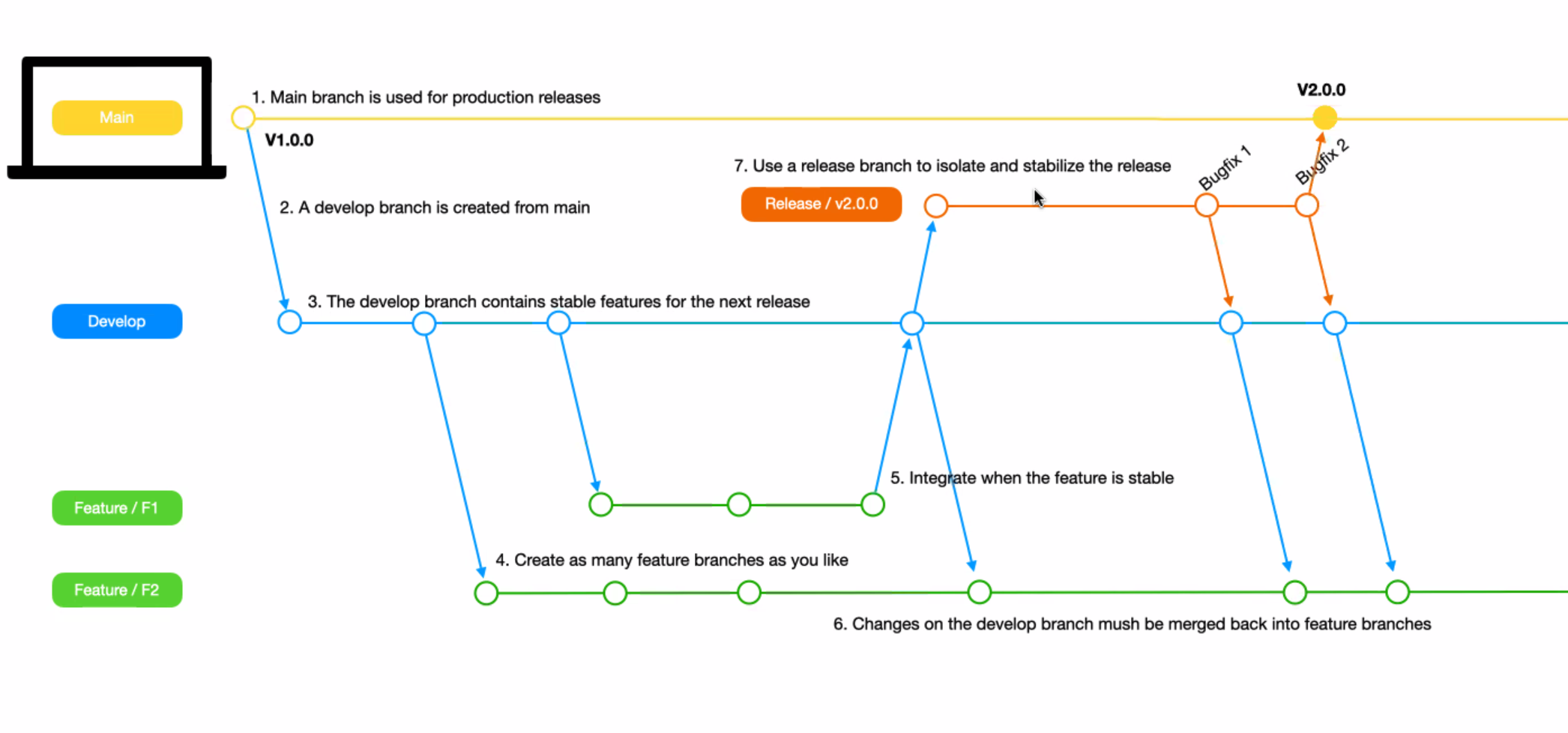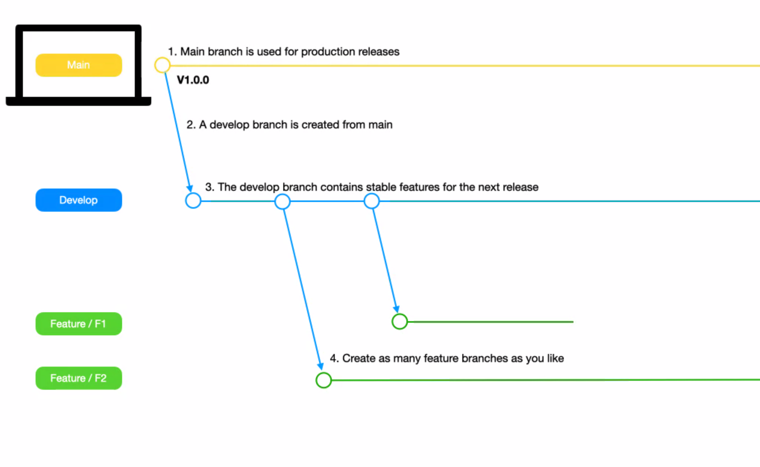 메인 브랜치의 커밋 단위는 실제 프로덕션 버전명으로 짓는다. 가장 최신화 된 기능이 있는 메인 브랜치로부터 가지를 시작해 디벨롭 브랜치를 생성한다. 여기서 디벨롭 브랜치는 각 개발자들이 만든 기능들을 모두 합치는 곳이다. 그러므로 각자 기능개발은 피처 브랜치를 생성해 진행한다.