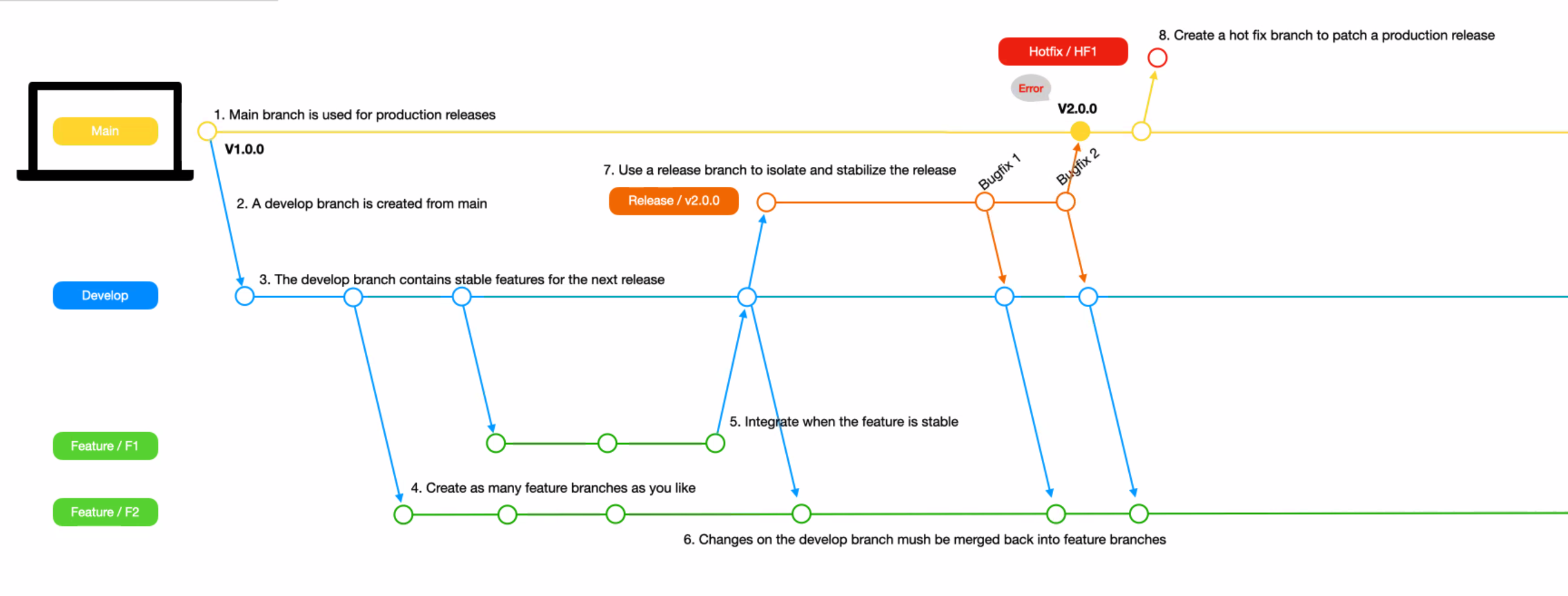 여기서 끝나면 정말 해피엔딩이겠지만 실제 서비스를 운영하는 도중에 버그를 발견하게 될 경우도 있다. 그러나 이 버그는 디벨롭 브랜치에서 수정할 수 없다. 이미 다음 릴리즈 버전의 기능들이 포함되어 있을 가능성이 크기 때문이다. 또한 실제 운영중인 서비스의 결함은 치명적이기 때문에 핫픽스 브랜치에서 빠르게 수정한다. 그리고 마찬가지로 수정된 버그들은 반드시 최신화 시켜주어야한다.