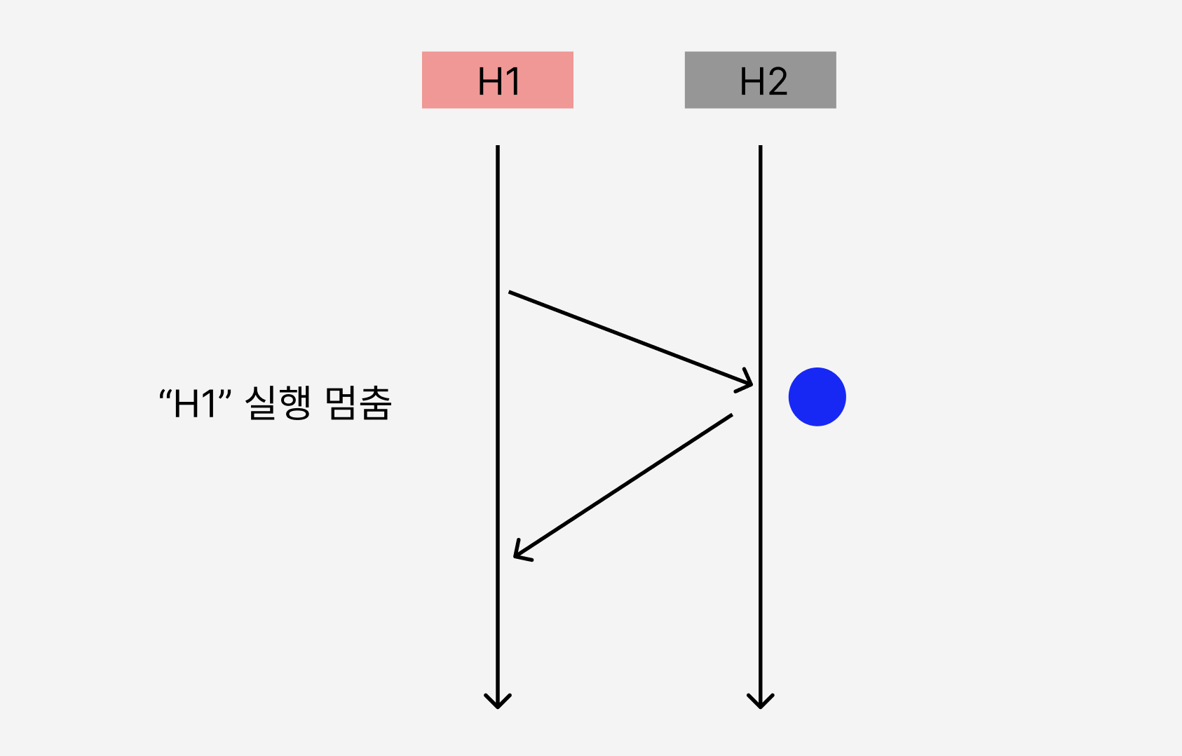 그와 반대로 제어권이 없던 "H2"함수는 동작을 멈춘상태로 있다가 "H1"함수로부터 제어권을 받으면 동작한다.
