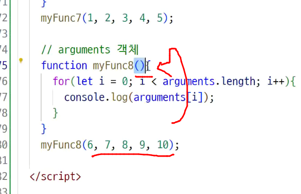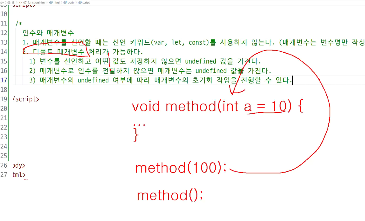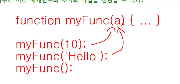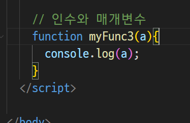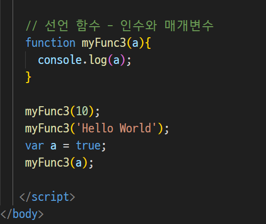 인수,매개변수 선언 : 전달된 값을 사용할 수 있게끔 만들어주는 것
