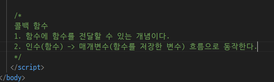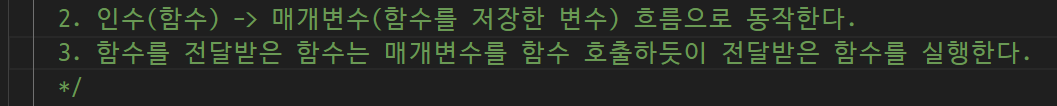 매개변수가 function 저장가능 -> 매개 변수가 function 저장한다 -> function에 function을 전달한다(함수의 인수로 함수를 전달하면 매개변수가 그걸 받아서 매개변수가 또 함수가 됨)