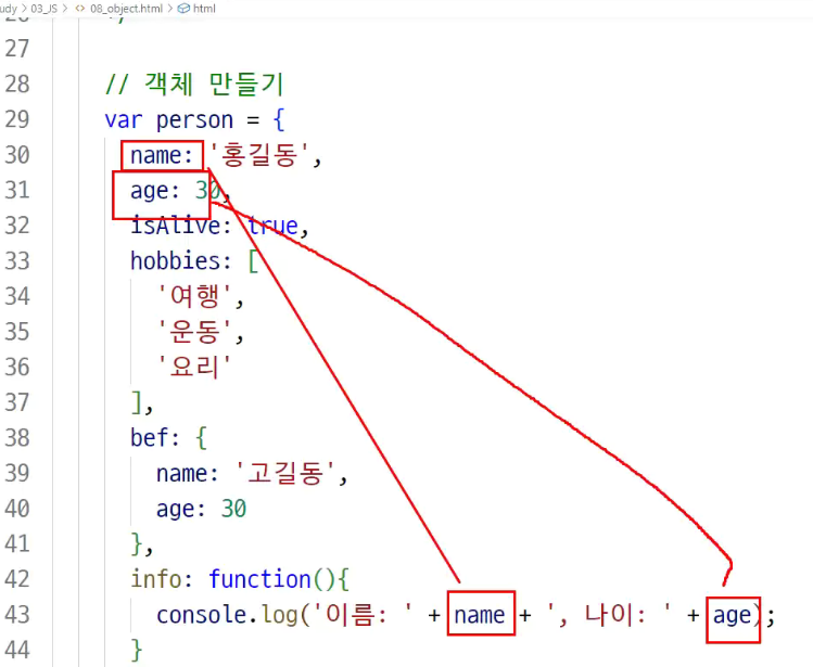 -> property라고 부르고 마침표 찍어서 속성을 호출하거나 [대괄호]안에 문자열을 적어서