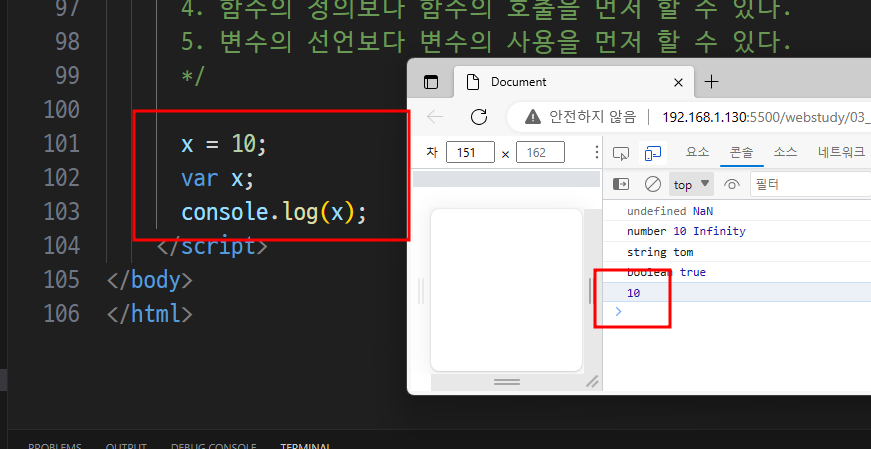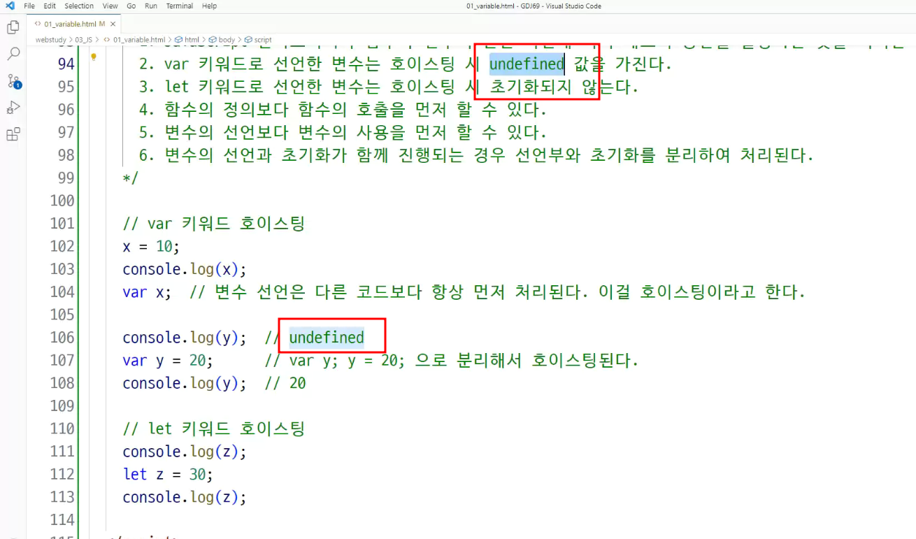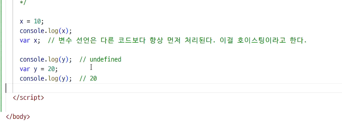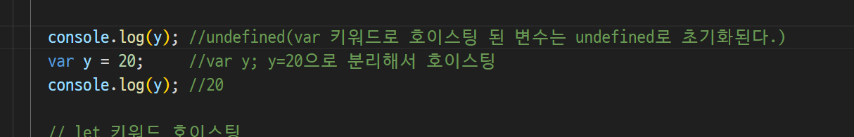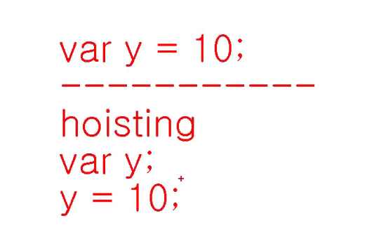 -> var y를 선행해서 위로 올림 (그때 undefined를 가짐)