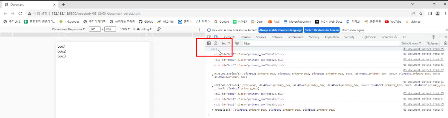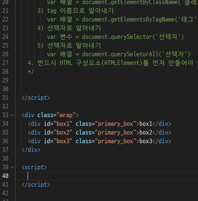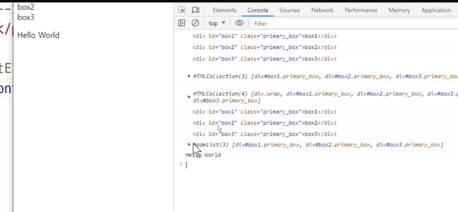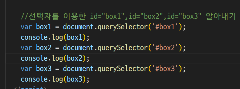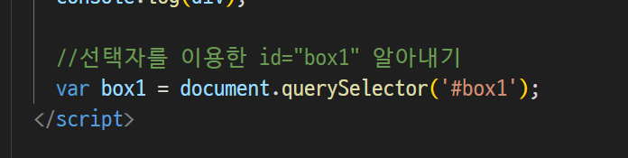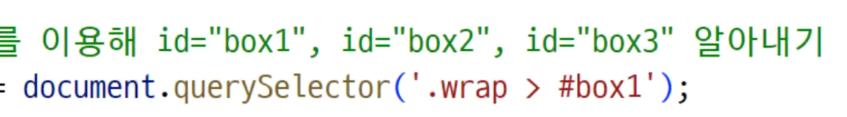 -> 선택자를 이용해서 , id(#box1)를 선택자로 써서 동일한건 하나뿐이다 => 그래서, querySelector 썼음
