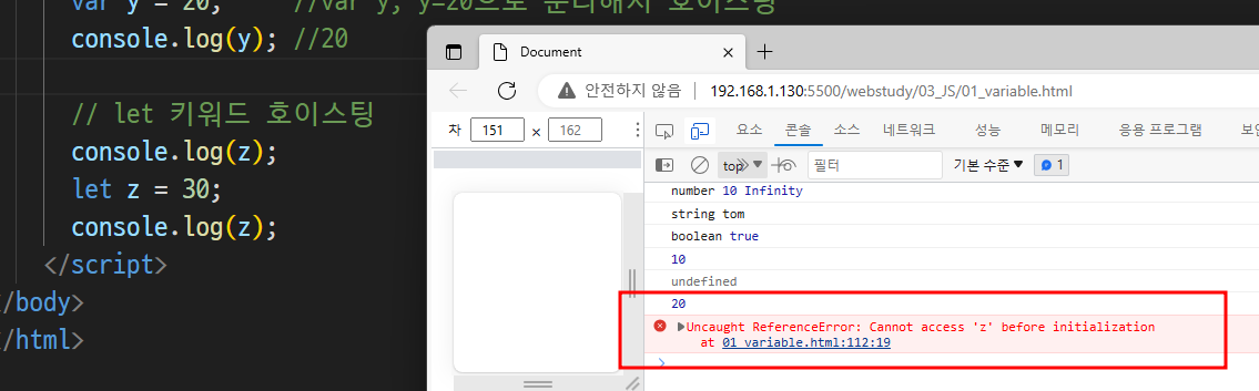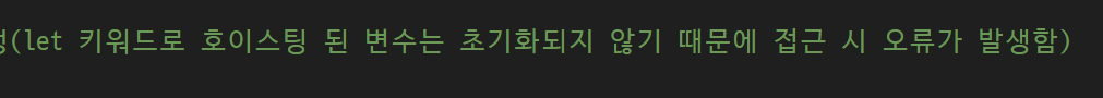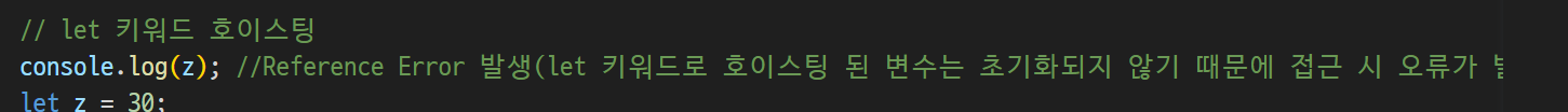 -> let키워드는 let z 를 빼고 위로 올림(호이스팅되면 초기화되지 않아서 -> 값이 없음)
