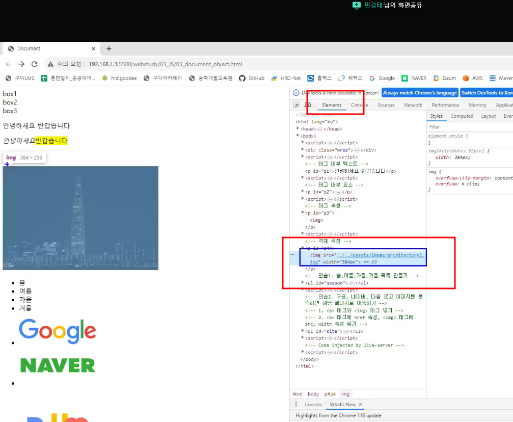 element에서 보이는 결과물은 javascript로 조작한 결과물을보는것(원래 태그라고 생각하면 틀림)