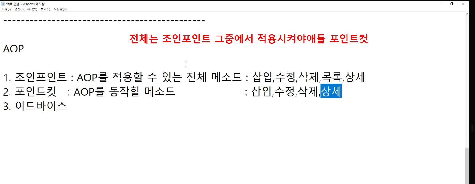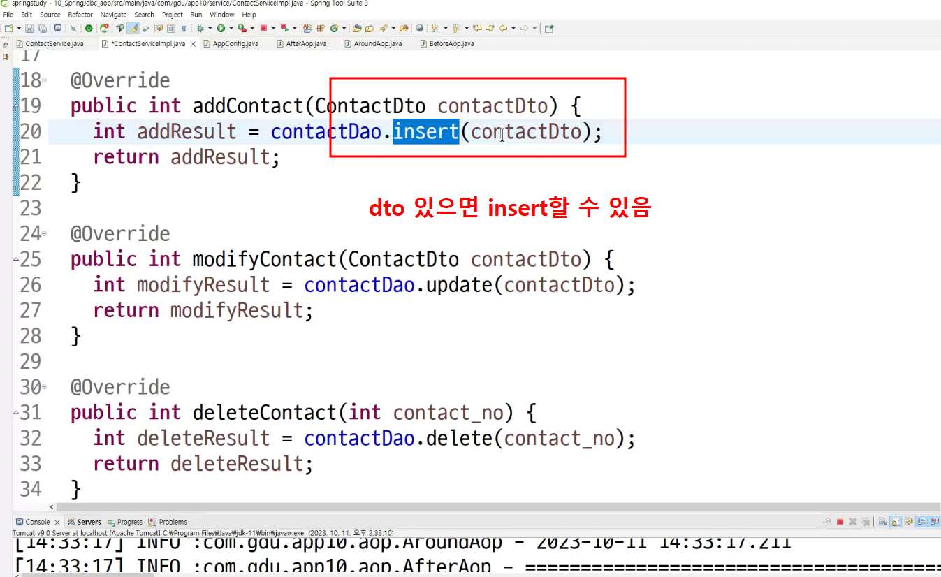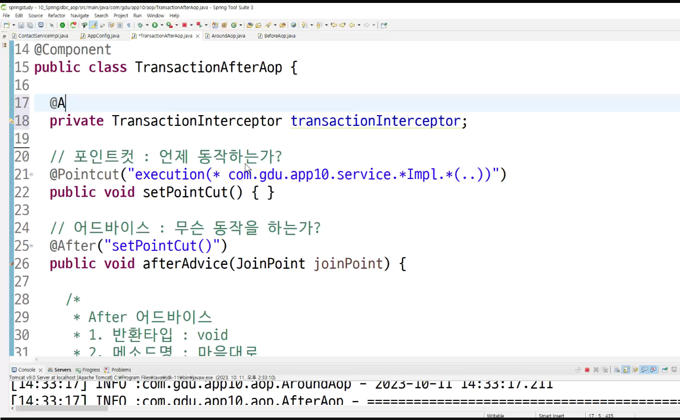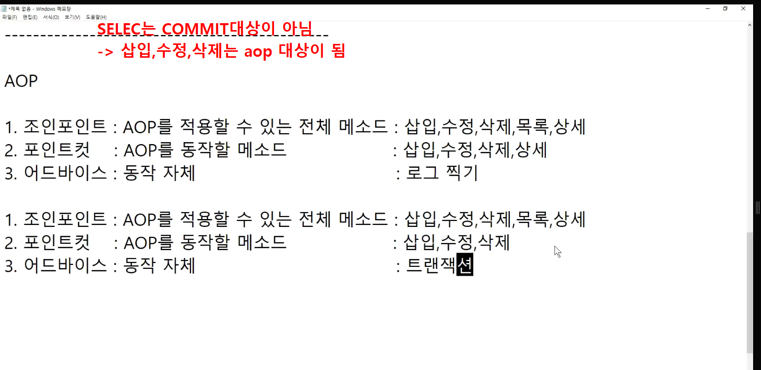 -> 서비스단에서 제일 적절한 aop 동작 확인 ; transaction트랜잭션임