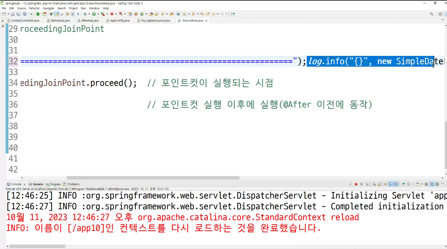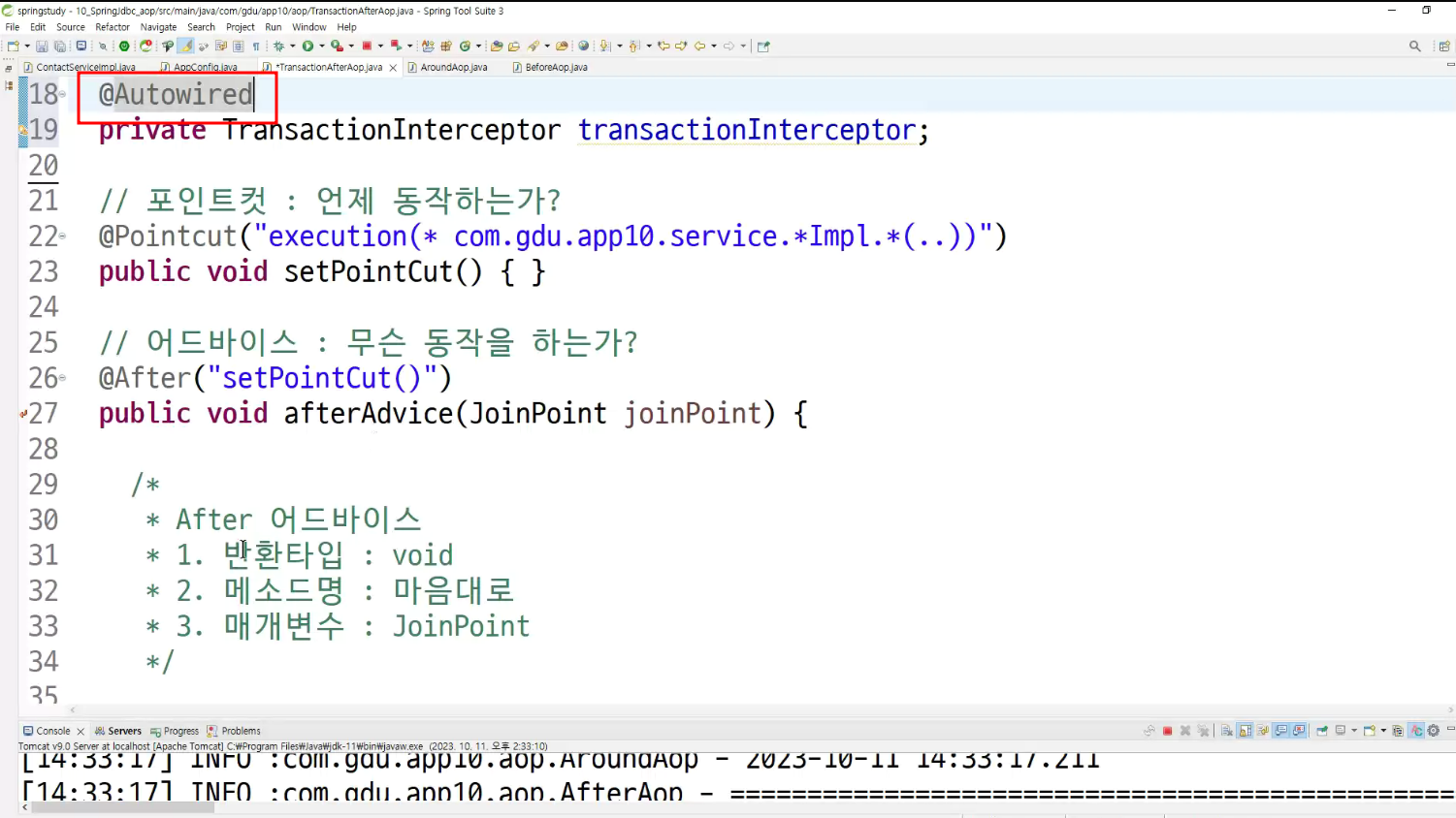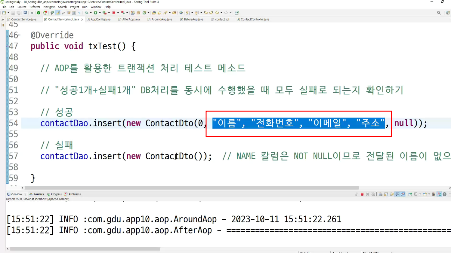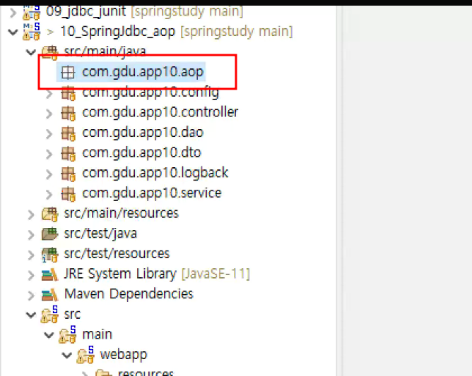 -> 서비스단에서 제일 적절한 aop 동작 확인 ; transaction트랜잭션임