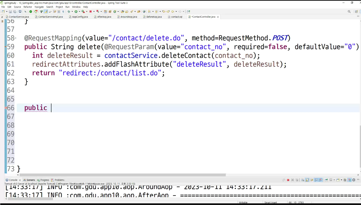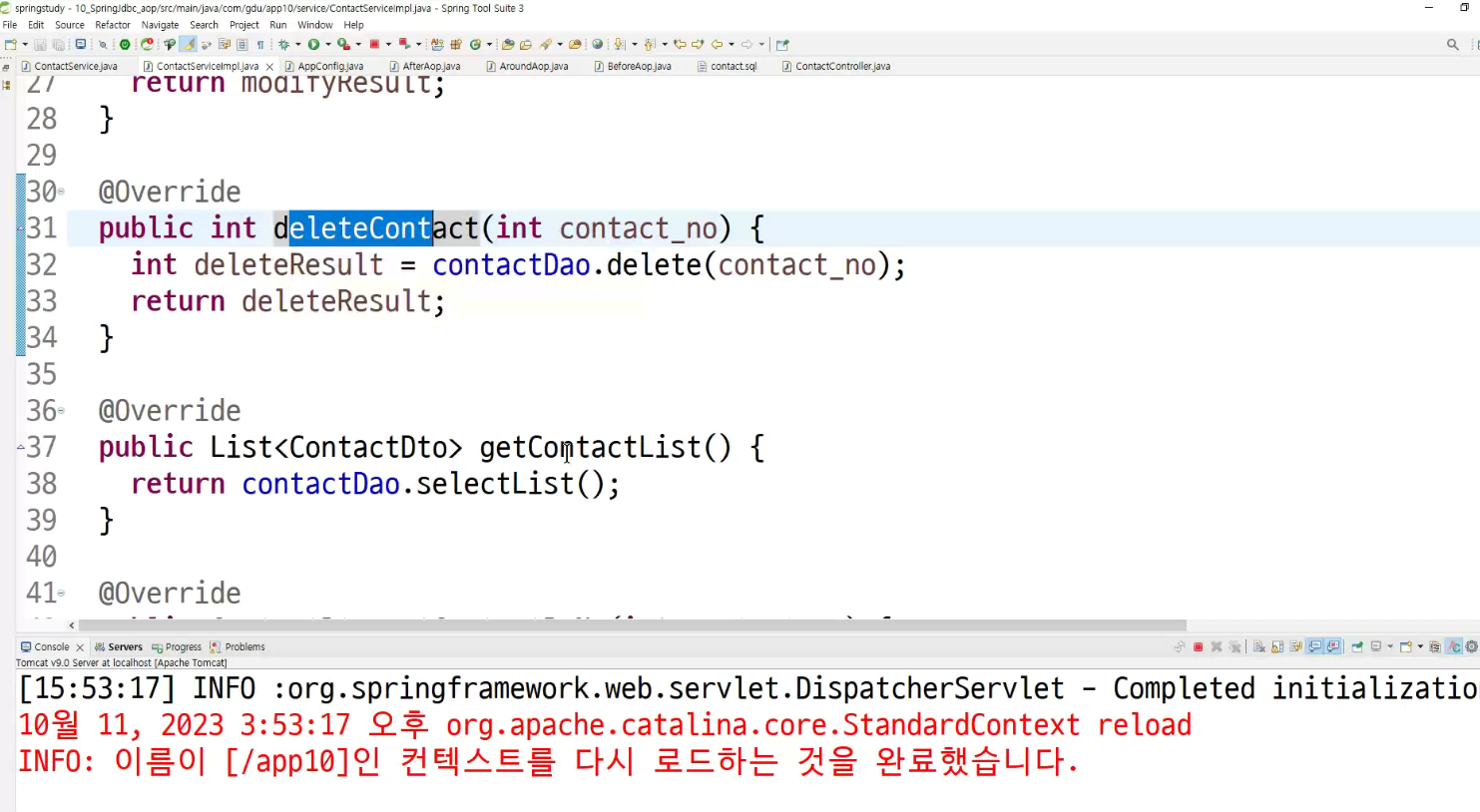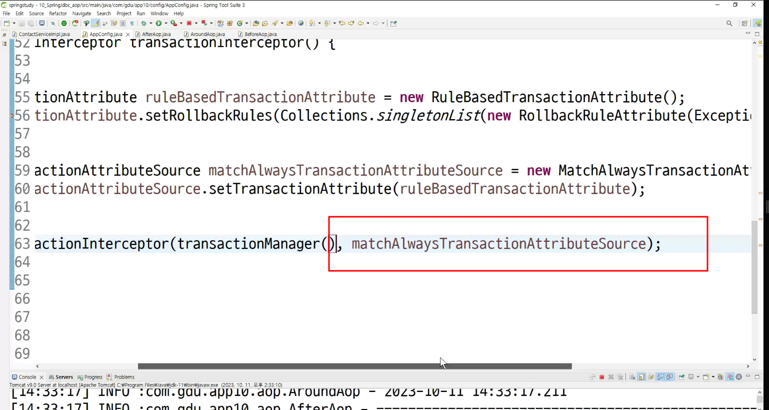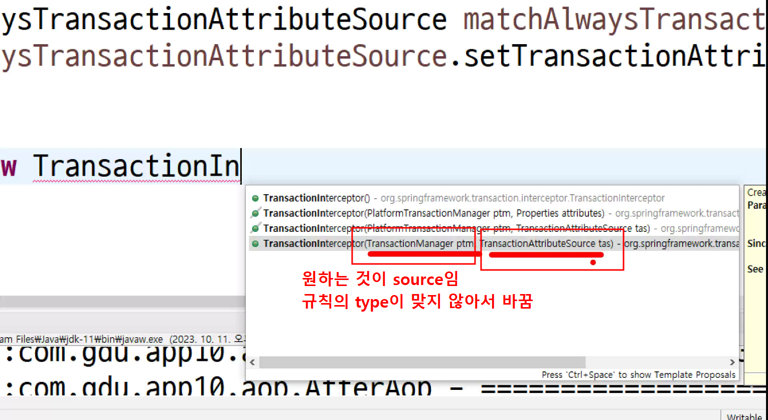 -> 서비스단에서 제일 적절한 aop 동작 확인 ; transaction트랜잭션임