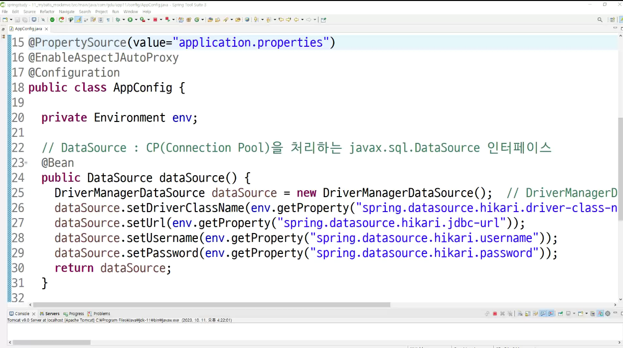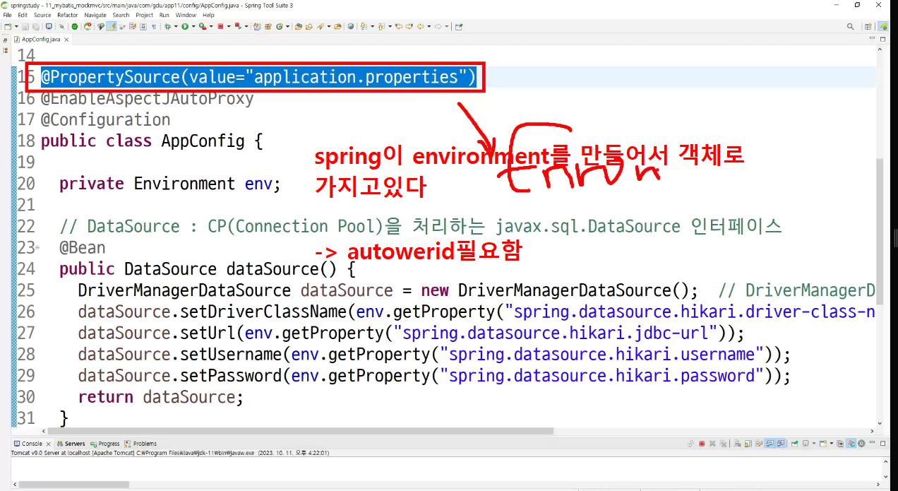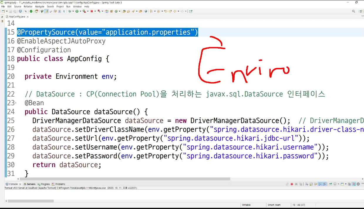 -> 해당 프로퍼티를 불러들어서 enviroment 를 제작을 해서 spring이가지고잇음