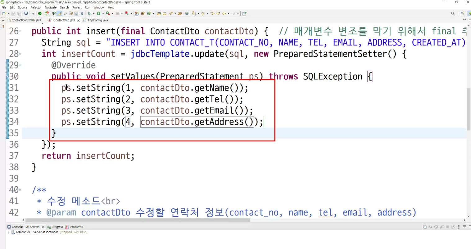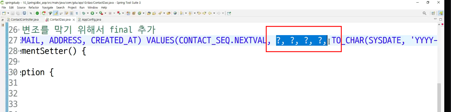 -> query문 처음에 전달하고 preparedstatement에 ?값 채워주는 코드만 처리하는 코드