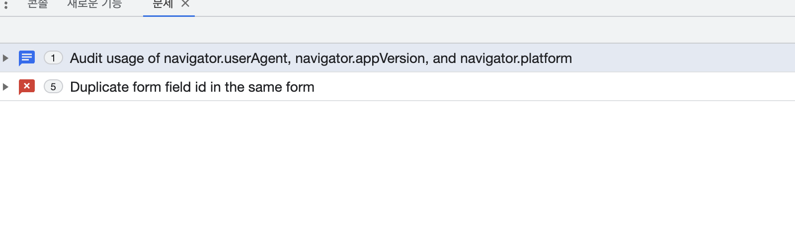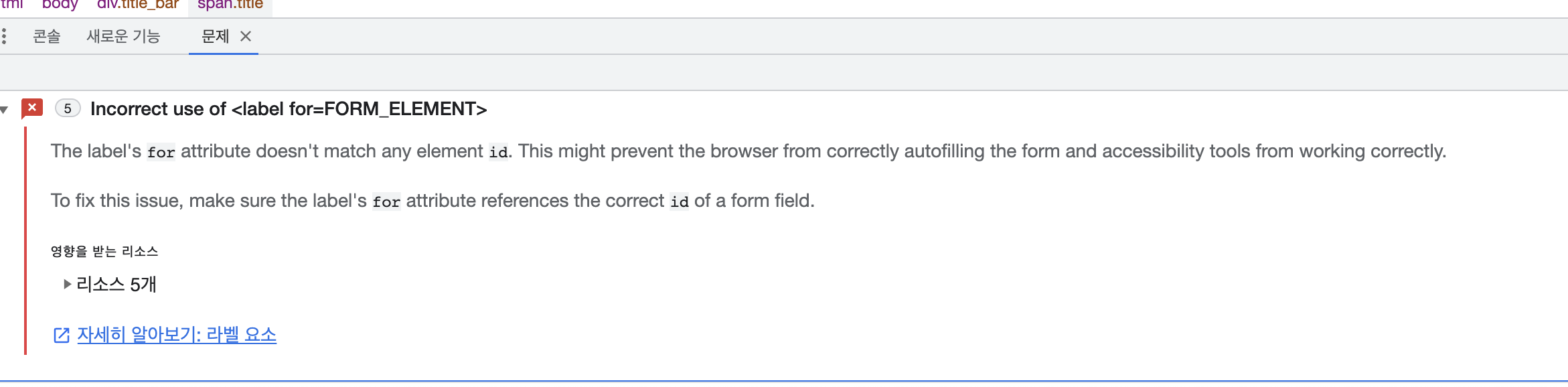 앞서 for문을 이용해서 리스트를 출력하면서 id를 name으로 바꿔서 사용했더니 label은 짝이 되는 input의 id와 label for의 값이 같아야하는데 그렇지 못해 다음고 같은 에러가 발생하였다.