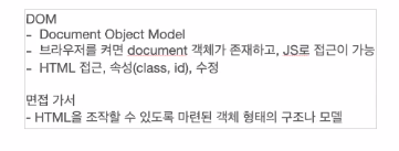 (면접용) : HTML을 조작할 수 있도록 마련된 객체 형태의 구조나 모델 이며 JS로 접근 가능하다.
