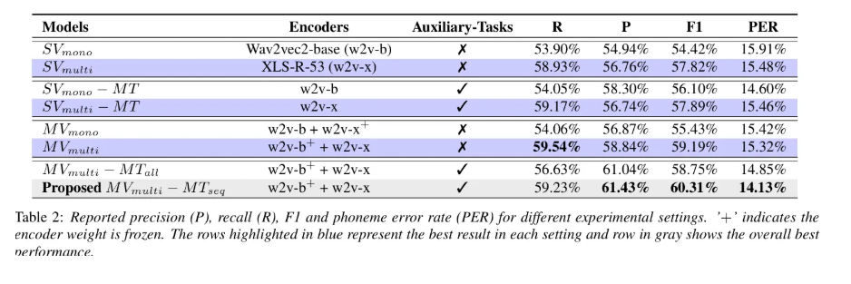 L2-ARCTIC ๋ฐ์ดํ„ฐ๋กœ ์‹คํ—˜๊ฒฐ๊ณผ ๋ชจ๋“  SOTA ๋ชจ๋ธ ๋Šฅ๊ฐ€ํ–ˆ์œผ๋ฉฐ ๊ธฐ์กด single-view, multi-view baseline ๋Œ€๋น„ ๊ฐ๊ฐ 11.13%, 8.60% PER (์Œ์†Œ ์˜ค๋ฅ˜์œจ) ๊ฐ์†Œ, 5.88%, 2.49% F1 Score ์ƒ์Šน์„ ๋ณด์ž„