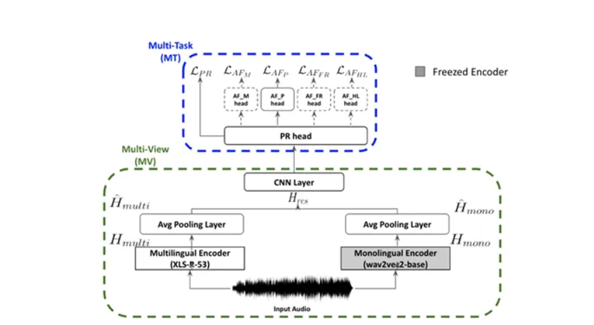 • L2 ํ™”์ž (๋…ผ๋ฌธ์€ L1 ์„ ์˜์–ด๊ถŒ์œผ๋กœ ๋‘๊ธฐ ๋•Œ๋ฌธ์— ๋น„์˜์–ด๊ถŒ ์‚ฌ๋žŒ) ์˜ ๋‹ค์–‘ํ•œ ๋ฐœ์Œ ์˜ค๋ฅ˜๋ฅผ ํŒŒ์•…ํ•˜๊ธฐ ์œ„ํ•ด ์˜์–ด ์ธ์ฝ”๋”์™€ ๋‹ค๊ตญ์–ด ํ•™์Šต๋œ ์ธ์ฝ”๋”๋ฅผ ๋ณ‘๋ ฌ๋กœ ์‚ฌ์šฉํ•œ ํ›„ ์กฐ์Œ ํŠน์„ฑ ๋ถ„๋ฅ˜๋ฅผ ๋ณ‘๋ ฌ ํ•™์Šต์‹œ์ผœ ๋ฐœ์Œ ํƒ์ง€ ์„ฑ๋Šฅ์„ ๊ทน๋Œ€ํ™”
