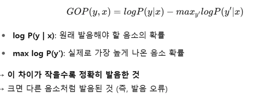 - ASR ์˜ ๋กœ๊ทธ ์‚ฌํ›„ ํ™•๋ฅ  ํ™œ์šฉํ•ด์„œ ๋ฐœ์Œ ์ •ํ™•๋„ GOP ์ ์ˆ˜ ๊ณ„์‚ฐ