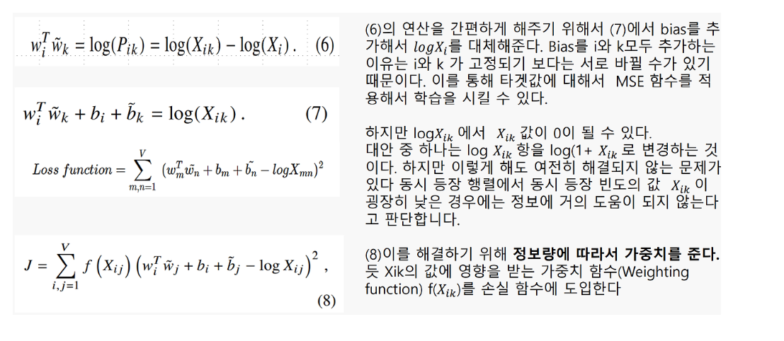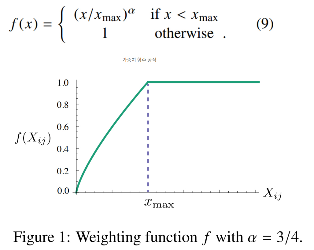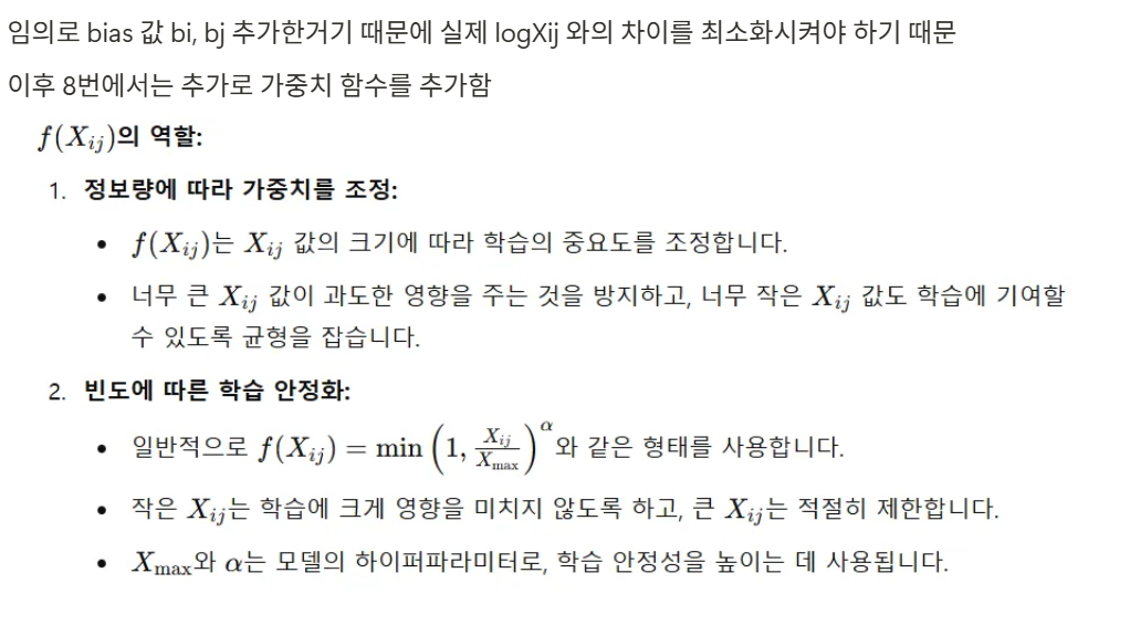 또한 아래 f(xij) 를 추가하는 이유는 log 값에 의해 만약 xij 빈도수가 너무 작으면 제곱한 값이 무한에 가깝게 되기 때문에 이를 조절하기 위해 f(xij) 를 앞에 곱해줘서 추가.
