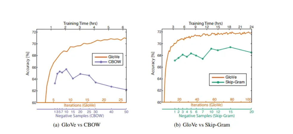Glove 모델은 global log-bilinear regression model로, global matrix factorization(통계적 정보 활용)와 local context window method(단어 사이의 여러 측면에서의 유사도) 두 방법론의 장점을 골라 만들어진 모델이라고 볼 수 있음.