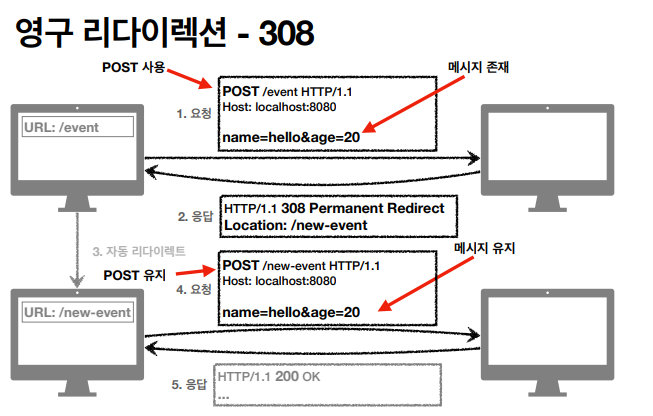 - 307 Temporary Redirect : 리다이렉트시 요청 메서드와 본문 유지 (MUST NOT)