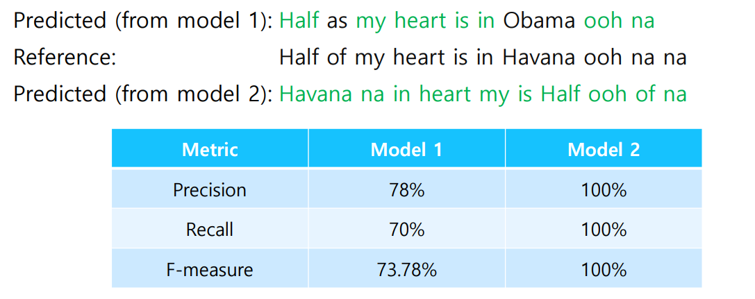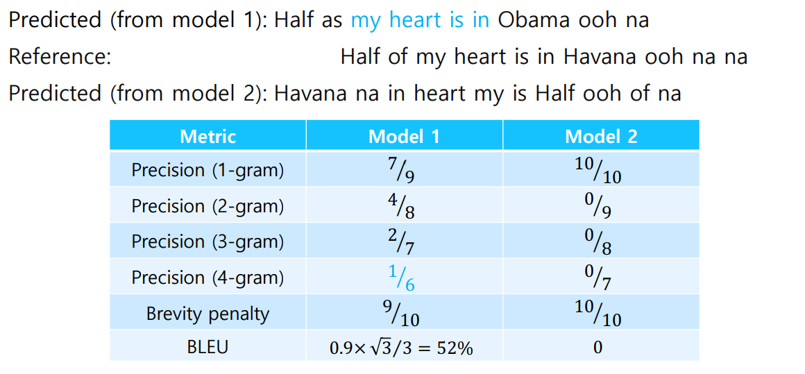 - brevity penalty를 추가한다. (길이가 너무 짧은 경우 고려)