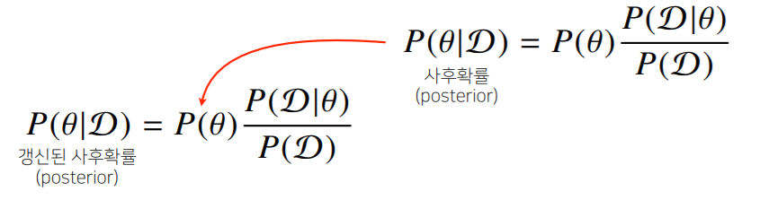 - 베이즈 정리를 통해 새로운 데이터가 들어왔을 때 앞서 계산한 사후확률을 사전확률로 사용하여 갱신된 사후확률을 계산할 수 있다.