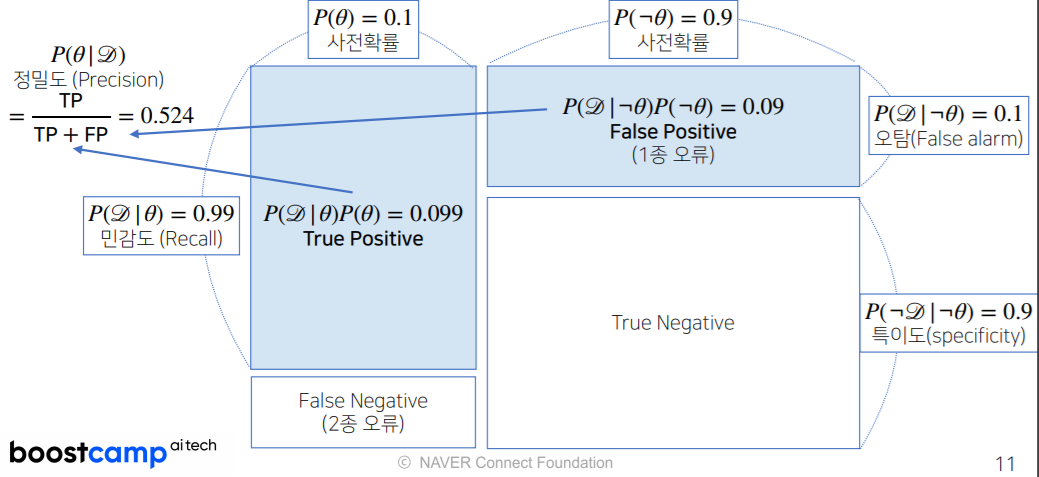 - P(θ∣D)는 사후확률(posterior), P(θ)는 사전확률(prior), P(D∣θ)는 가능도(likelihood), P(D)는 Evidence이다.