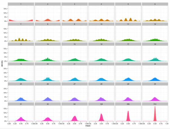 - 통계량의 확률분포를 표집분포(sampling distribution)라 부르며, 특히 표본평균의 표집분포는 N이 커질수록 정규분포 N(μ,σ2/N)를 따른다. 다음은 그에 대한 예시이다.